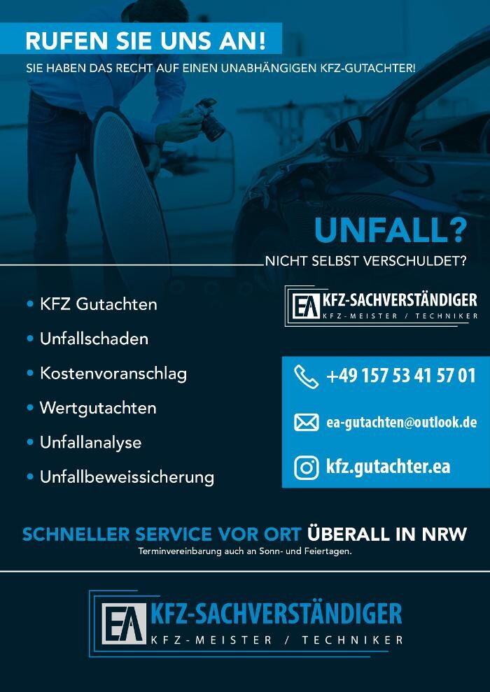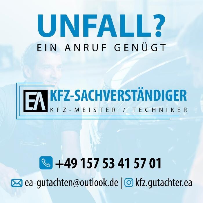 Herzlich willkommen bei EA Kfz-Sachverständiger! Wir sind Ihr kompetenter Partner für alle Fragen rund um Kfz-Sachverständigendienste. Mit unserem erfahrenen Team von Gutachtern und Meistern/Technikern stehen wir Ihnen zur Seite, um Ihnen professionelle und zuverlässige Unterstützung zu bieten. Egal ob Unfallbegutachtung, Fahrzeugbewertung oder technische Gutachten - bei uns sind Sie in guten Händen. Ihre Zufriedenheit und Ihr Vertrauen stehen für uns an erster Stelle. Kontaktieren Sie uns gerne, um mehr über unsere Dienstleistungen zu erfahren oder um einen Termin zu vereinbaren.